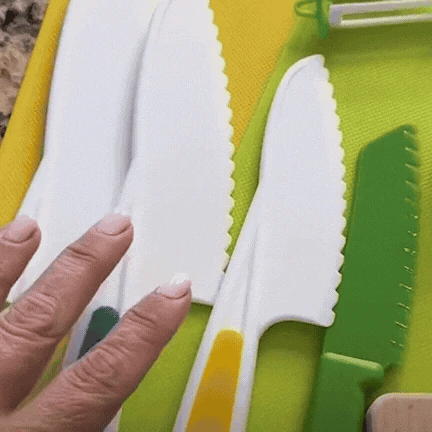 La lame en plastique dentelée de PetitChef™ tranche les fruits, les légumes et le pain - sans risque de blessure. Notre kit est fabriqué à partir de matériaux non toxiques de haute qualité, pour que les enfants puissent explorer la cuisine en toute sécurité et en toute confiance. Regardez-les gagner en autonomie tout en s'amusant !